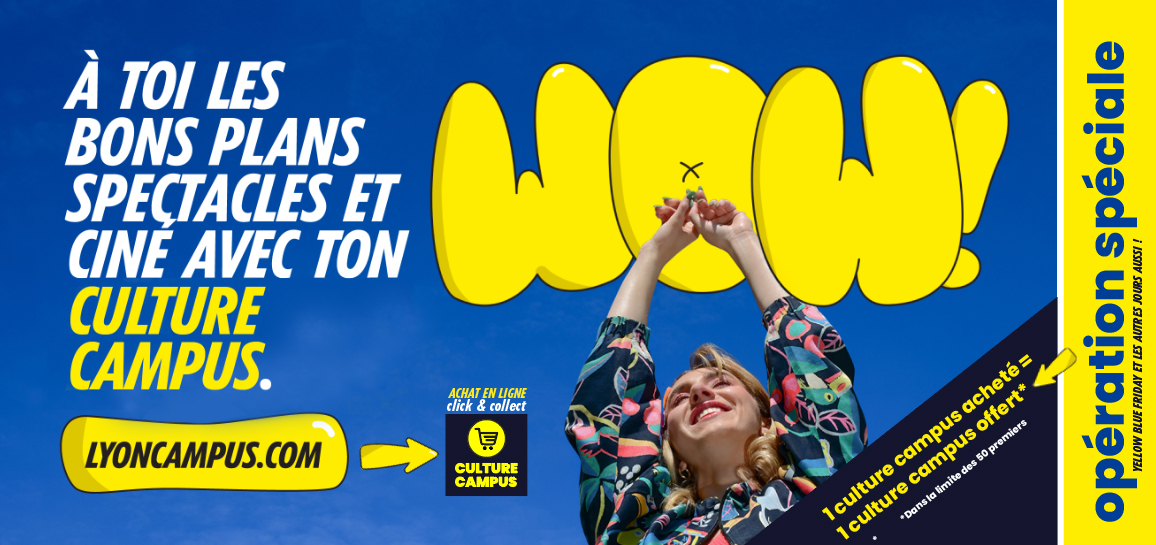 - ou rendez-vous en ligne pour l'acheter, puis vous récupérez votre carnet au choix dans 5 lieux en ville et sur les campus : Point culture de l’Université Jean Moulin Lyon 3 à Lyon 8e ou Info-Jeunes à Lyon 2e ou Mission culture Lyon 1 à Villeurbanne ou Service culturel de Lyon 2 à Bron ou La Maison des étudiants de la Métropole de Lyon dans le 7e. Il sera possible de récupérer son culture campus acheté sur la période de décembre jusqu'au 23 décembre (puis à partir du 5 janvier dans la limite d'un mois après son achat).