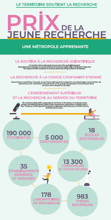Parceque le territoire soutient la recherche, la Métropole et la Ville de Lyon, en partenariat avec la ComUE Université de Lyon, décernent chaque année le Prix de la Jeune Recherche. Il distingue des lauréats dont le talent, après la thèse, a été confirmé par des premiers travaux de recherche remarquables mais également un investissement dans la diffusion de la culture scientifique et la transmission de leurs travaux auprès de la société civile.