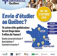 - Quoi ? Les universités québécoises viennent à votre rencontre. Venez explorer la grande variété de programmes d’études et rencontrer les responsables d’admission qui vous aideront à choisir le cursus qui répond au mieux à vos attentes et à vos objectifs professionnels.