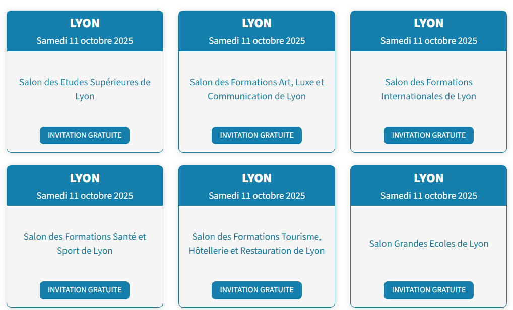 Quoi ? Le magazine l'Etudiant propose 6 salons à Lyon : salon santé social, paramédical et sport - salon grandes écoles - salon arts, digital et communication, salon masters, MS et MBA en France et à l'international, salon formations et recrutement en alternance