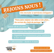 - Quoi ? Les petites cantines de Vaise recherche ses prochains volontaires en service civique pour faire mijoter des idées et des plats ! 'objectif de la mission : co-animer des repas participatifs, organiser des événements pour renforcer le lien social. Volontariat 28/semaine sur une durée de 6-8 mois.