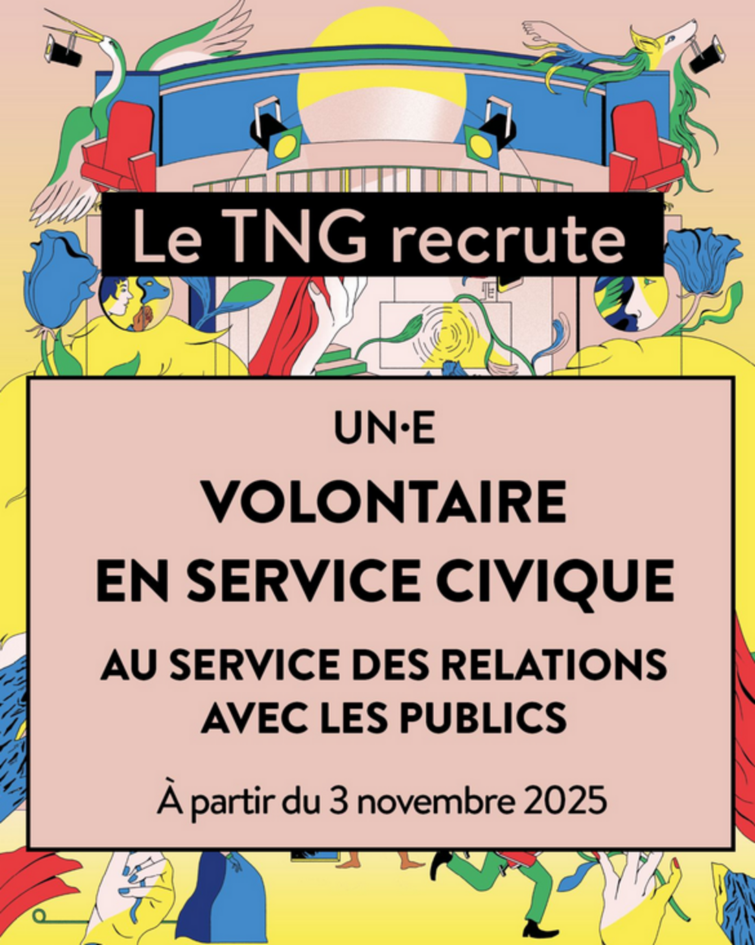 Alors un volontariat en service civique au TNG est fait pour toi avec un contrat de 8 mois – 28h hebdomadaires - Comment ? Candidature à Delphine Drevon, directrice du service des publics : rp(at)tng-lyon.fr