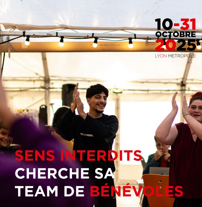 - Quoi ? Dès le 10 octobre, est lancé la 9e édition de Sens Interdits. le festival recherche des bénévoles pour accueillir le public, accompagner les artistes, donner un coup de main en coulisses, le tout dans un environnement qui questionne et fait bouger les lignes. Ça te dit ?