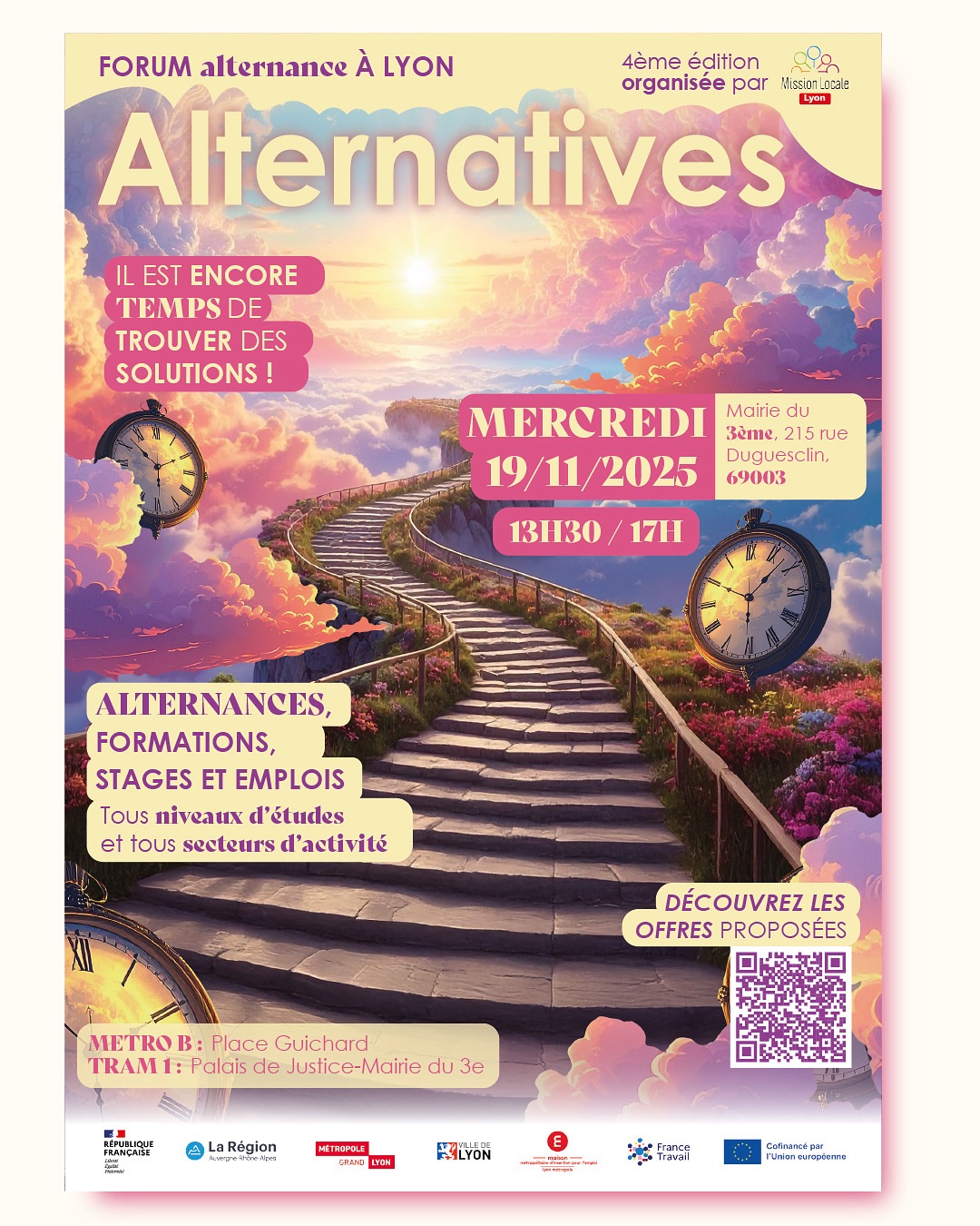 - Quoi ? La Mission Locale de Lyon propose la 4e édition du Forum Alternatives, à la mairie du 3e, 215 rue Duguesclin, avec plus de 200 offres d'emploi en alternance, en stage, en emploi, en formation. Tous domaines d'activité et tous niveaux d'étude.