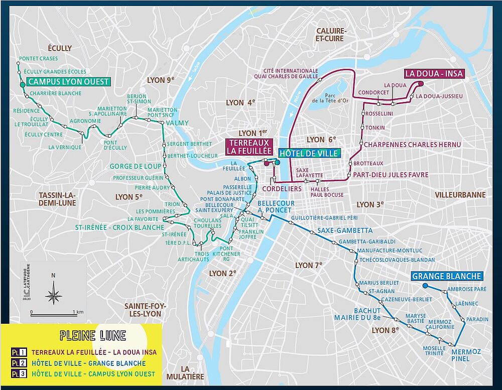 - PL 1 : Terreaux La Feuillée > Cordeliers Bourse > Part-Dieu Jules Favre > Charpennes C. Hernu > La Doua INSA > Cité Internationale > Terreaux la Feuillée