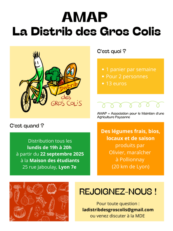 Mangez sain, à prix raisonnable, tout en soutenant un producteur local, avec l'association La Distrib' des gros colis. Elle propose tous les lundis à la MDE divers produits locaux : légumes, pain, biscuits, produits laitiers... Vous pouvez tester en début d'année, puis vous inscrire à l'année ou au trimestre.