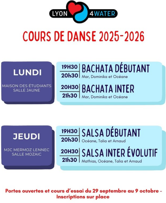 L’association Lyon 4 Water vous propose de danser solidaire ! Prenez des cours de Bachata à la MDE à tout petit prix, tout en agissant solidaire. En effet, la participation est entièrement reversée à l’ONG Wateraid qui milite pour l’accès à l’eau dans le monde.