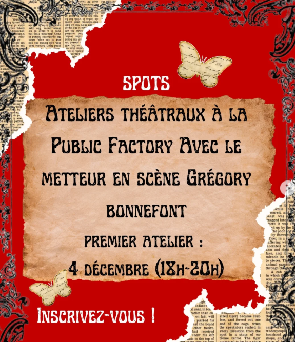 La Public Factory et l'association étudiante SPOTS vous invitent à participer à un cycle d’ateliers théâtraux organisés dans le cadre de la programmation culturelle et scientifique "Rendre justice" de la Public Factory.