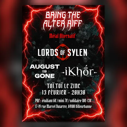 Un élan pour les gros riffs et des voix aussi bien mélodiques que saturées. Le 13 février, le Toï Toï accueille une soirée métal alternatif avec trois groupes, chacun proposant un univers distinct. Au programme : August Is Gone, Lords Of Sylen (Lyon) et Ikhor (Saint-Étienne), pour une immersion sonore intense et contrastée.