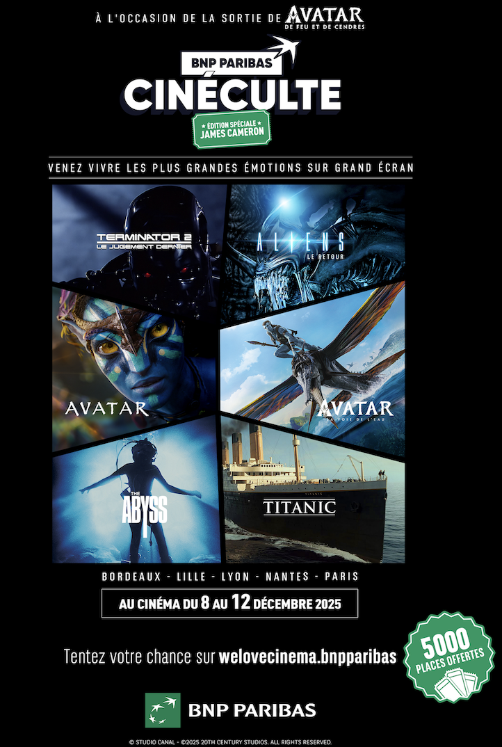 Cette année, et pour célébrer son partenariat avec le film « Avatar : de Feu et de Cendres » qui sortira en salles le 17 décembre, BNP Paribas a choisi une programmation 100% James Cameron.