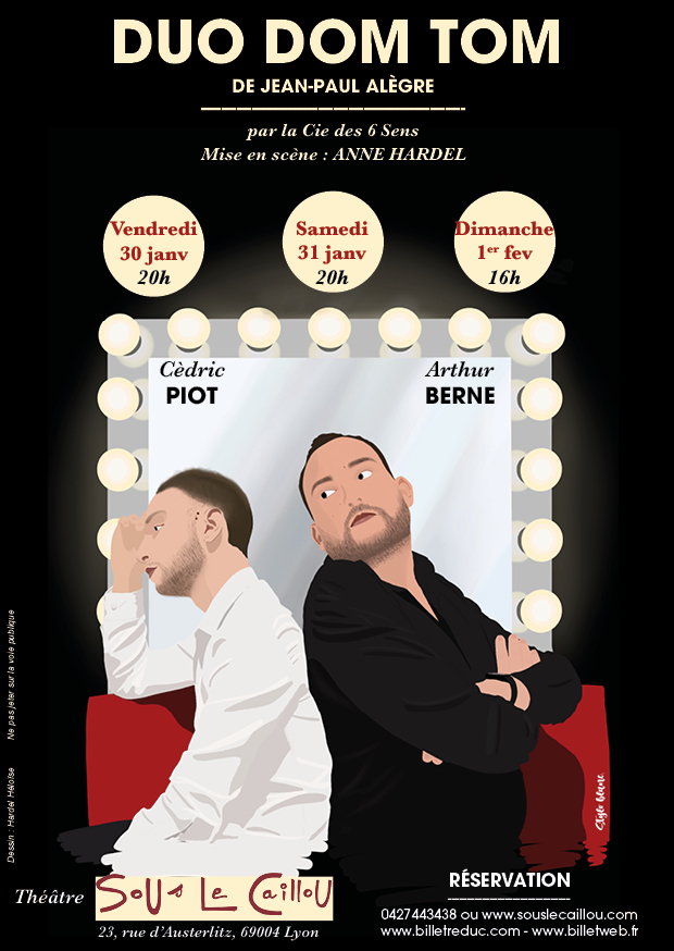 Il y’a dans ce DUO DOM TOM tous les ingrédients du théâtre dans le Théâtre, le terrain de jeu favori de Jean-Paul Alègre : Il montre l’envers du décor et réussit à faire rire de l’échec.