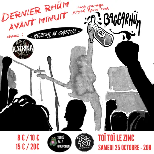 Une séparation, ça se fête ! Baggarhüm, toujours ivre de retourner les salles, célèbre la fin de ses canailleries drunk n’roll en balançant ses derniers riffs aux côtés de ses invités : le Psychedelic Spice Rock de Mezcal in Cactus et l’Indie Rock de Katrina. Et pour garder un souvenir, pas impossible que ce dernier tour de cirque soit capté… viens donc gueuler avec les Bagga une dernière fois ! Mais accroche-toi à ton godet : ça va tanguer !