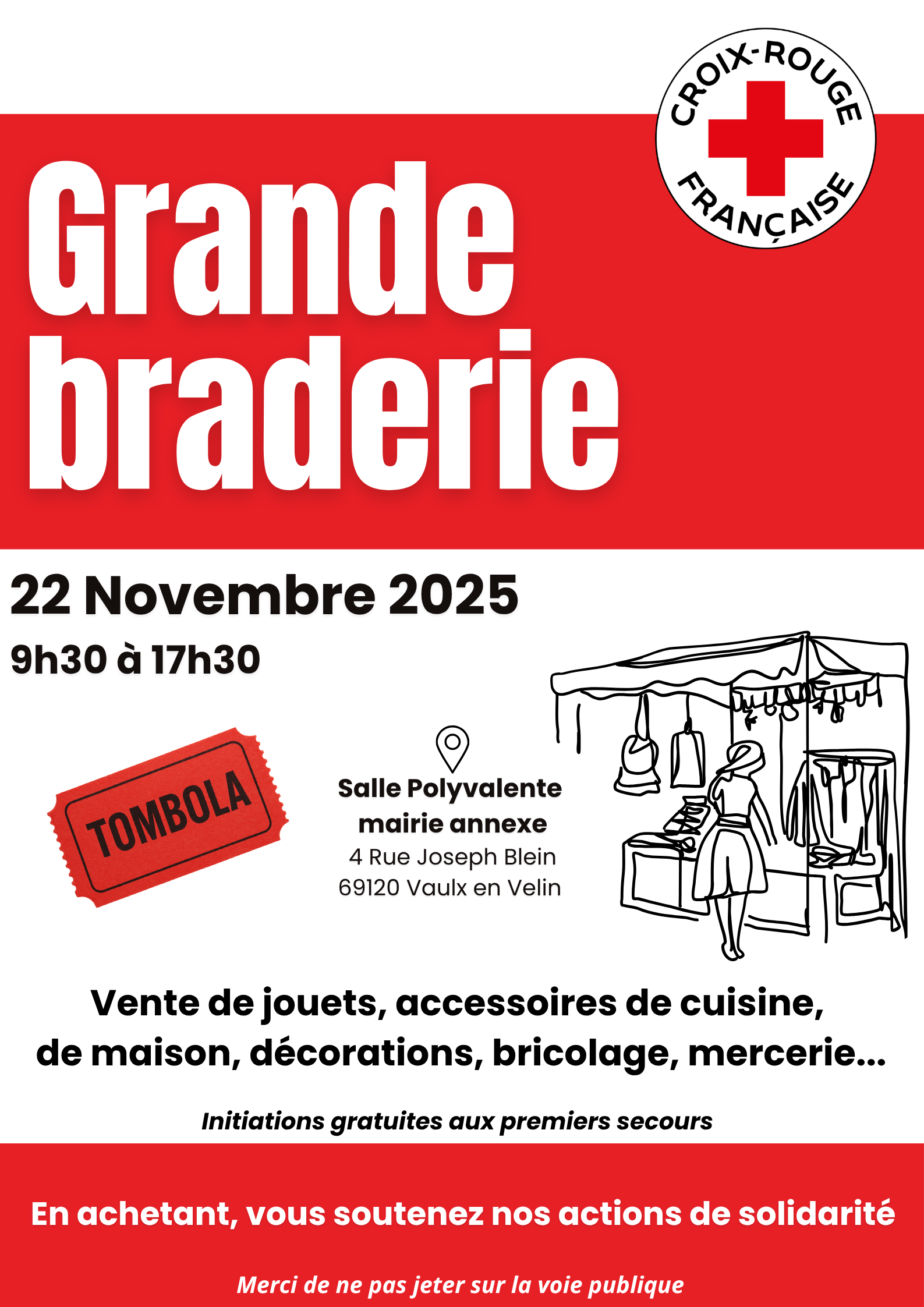 La Croix-Rouge française organise sa Grande Braderie solidaire le samedi 22 novembre 2025, de 9h30 à 17h30, à la salle polyvalente de la mairie annexe (4 rue Joseph-Blein, 69120 Vaulx-en-Velin).