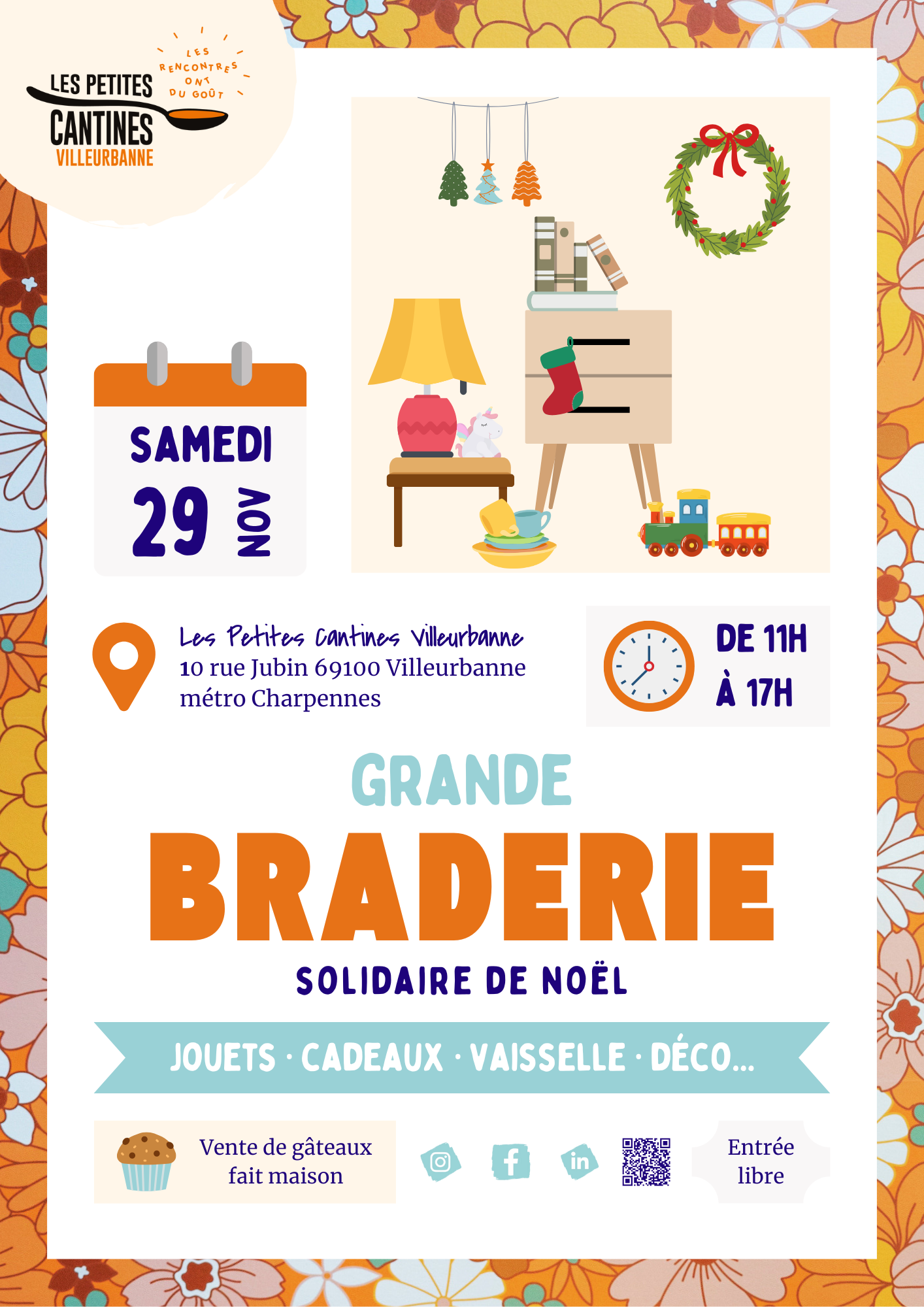 Samedi 29 novembre, entre 11h et 17h, la Petite Cantine de Villeurbanne organise sa Braderie Solidaire de Noël pour permettre à toutes et tous d'y dénicher de nombreuses pépites et préparer les cadeaux de noël, ou simplement s'équiper, le tout à prix libre. Décoration, livres, petit électroménager, jouets et jeux ... nul doute que vous en ressortirez avec des trouvailles à glisser sous le sapin, ou à garder pour vous !