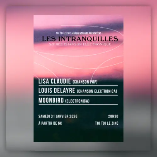 Le nouveau label lyonnais Brum Records présente trois artistes entre chanson, electronica et techno pour une soirée oscillant entre beats synthétiques et voix éthérées. Découvrez la pop audacieuse de Lisa Claudie, la chanson électronique de Louis Delayre et la technopop synthétique de Moonbird.