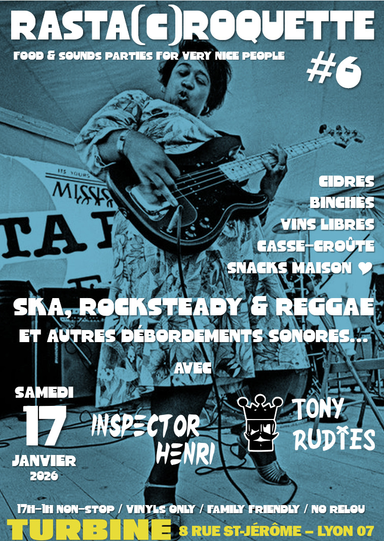 Soirée musicale en vinyles autour du ska, du rocksteady et du reggae, mêlant titres emblématiques et découvertes de la musique jamaïcaine à travers les sélections d’Inspector Henri et Tony Rudies, dans une ambiance conviviale, propice à l’écoute, au partage et à se bouger !