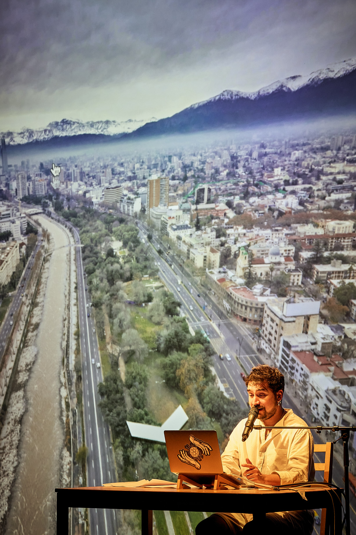 Assis derrière un ordinateur, face au public, il projette des images de ses grands-parents évoquant leurs luttes passées sous la dictature, ou celles d’autres Chiliens relatant leur situation actuelle, souvent précaire. Il relie entre eux les secrets enfouis de son pays. Par le biais de ces fragments de récits, le trentenaire trouve un écho jusqu’en Europe avec ce spectacle.